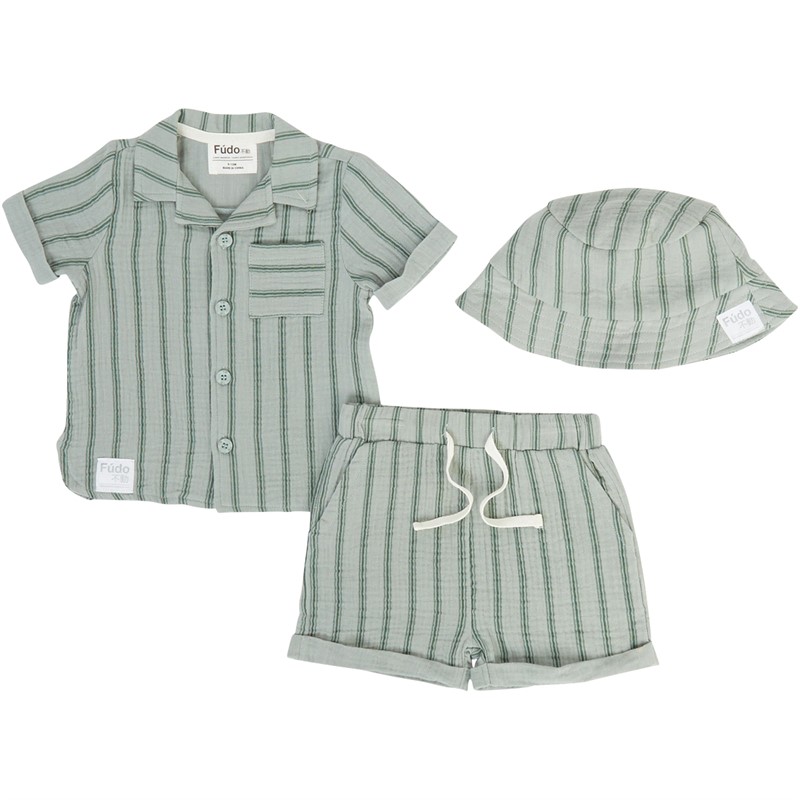 - Fudo Kids short sleeve shirt, shorts and bucket hat three piece set.