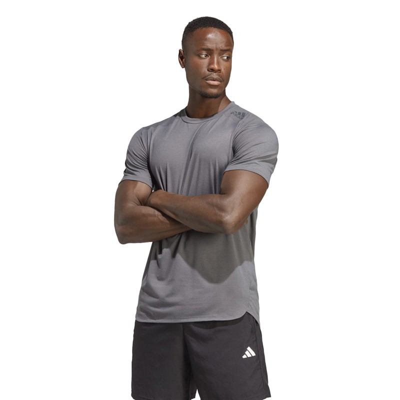 - adidas slim fit short sleeve training top. Whether you're going after that extra rep in the gym or fitting in a quick session at home, the Designed for Training Tee will help you make it count. Lift, pull, and push yourself to your limits, fully supported by dynamic cut lines and stretchy elastane that enables freedom of movement in upper body strength training. Tactical seam placement on the shoulders, arms and side body help to prevent chafing, while a unique lift panel will help you reach your gains without restriction. Using sweat-wicking or absorbent materials, adidas AEROREADY products keep you feeling dry as you move. IC2018