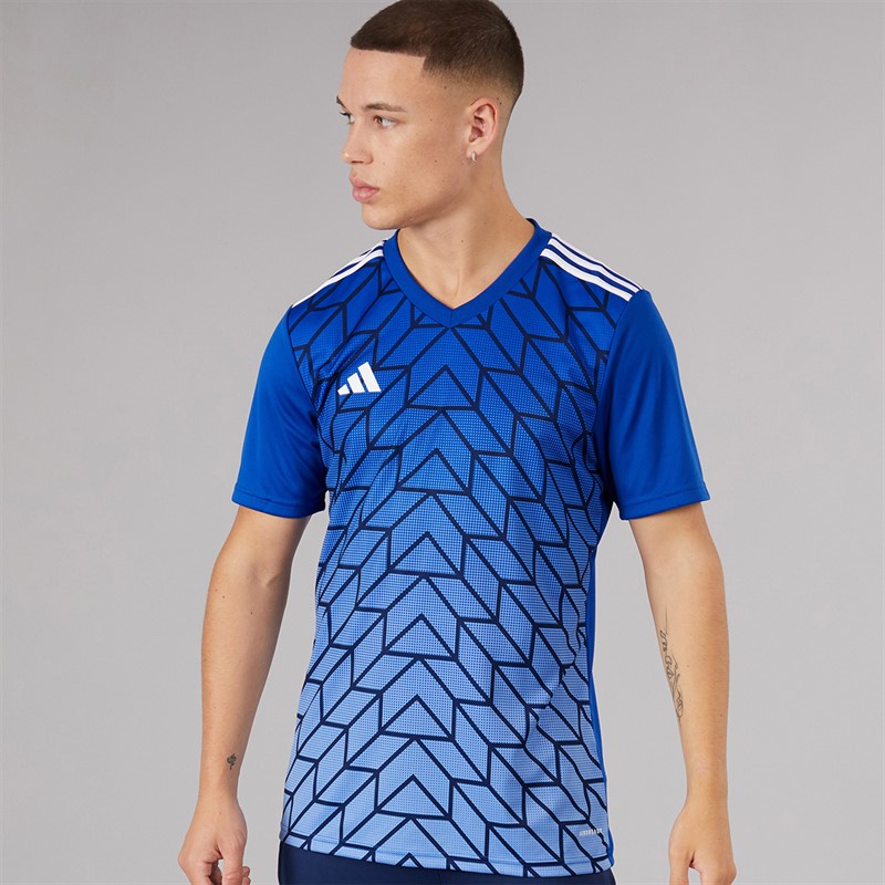 - adidas short sleeve t-shirt. Show your skills while displaying an iconic football look. The subtle geometric design on the front of this jersey traces its roots back to classic adidas kits from the late '80s. Behind the scenes, moisture-absorbing AEROREADY works hard to keep you and your teammates feeling as good as you look.Made with 100% recycled materials, this product represents just one of our solutions to help end plastic waste. HR2632