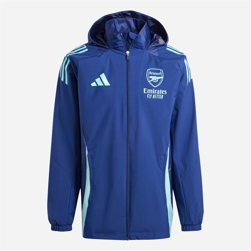 - adidas AFC Arsenal zip through hooded jacket. When the weather takes a turn at the training ground, make sure this Arsenal jacket is within reach. Part of an adidas range that flashes the fresh colours of the club's third kit, it features an integrated hood for added coverage and water-repellent plain weave fabric that's mesh-lined for comfortable football. A team badge lets your Gunners pride shine.This product is made with at least 70% recycled materials. By reusing materials that have already been created, we help to reduce waste and our reliance on finite resources and reduce the footprint of the products we make. IS9999