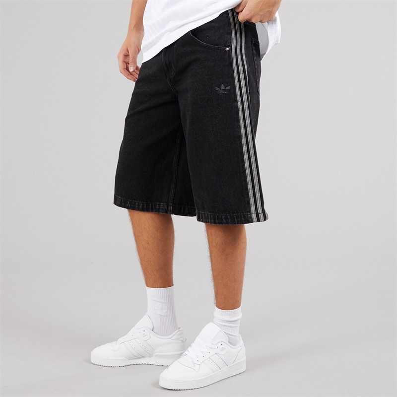 - adidas Originals loose fit denim shorts. These adidas shorts are made from soft denim fabric that's perfect for easygoing days. The loose shape creates a laid-back look and feel. Embroidery on the left leg and 3-Stripes down the sides show off your adidas pride. JC6719