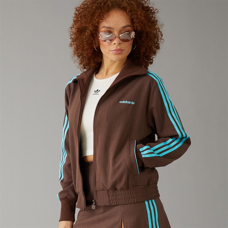 - adidas Originals zip through track top. With a nod to '70s style, this tailored tracksuit jacket from adidas is all about effortless chic. The herringbone weave gives it a polished vibe, and the tailored silhouette keeps it feminine. Pair it with matching pants for a modern take on a retro look. JX5311