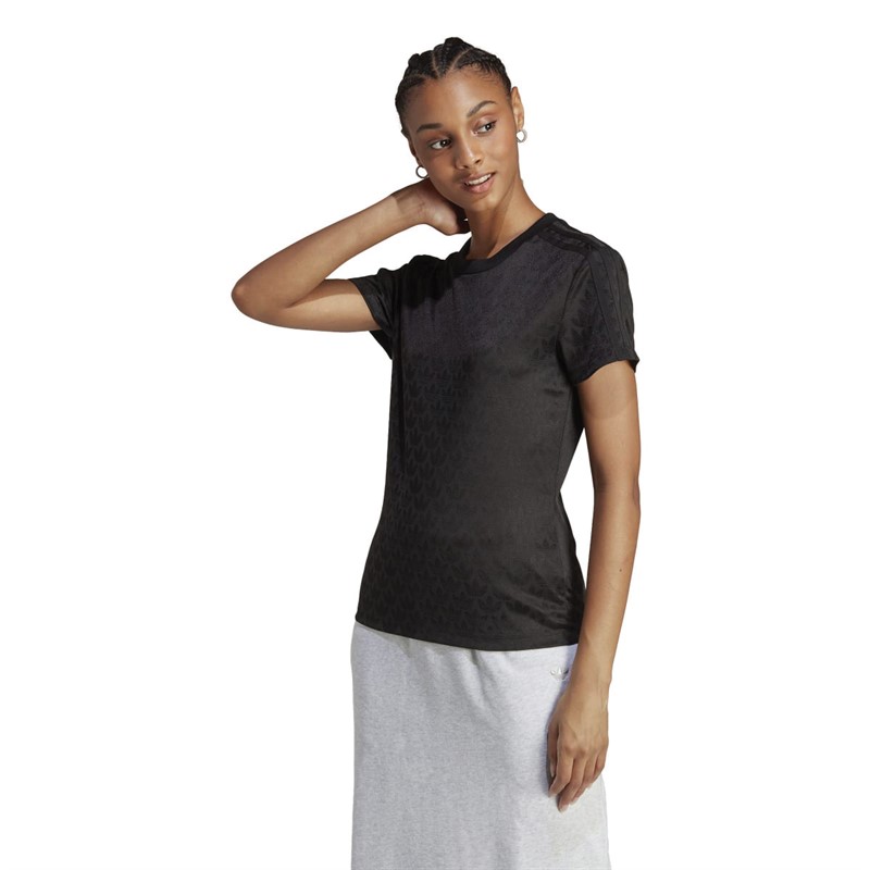 - adidas Originals slim fit short sleeve t-shirt. Revolutionary at the time of its invention, the jacquard technique that gives this adidas t-shirt its two-tone appearance made luxury accessible. Combined with another high-end emblem, the allover monogram, the two status symbols collide in this tee. Your otherwise traditional jeans-and-a-tee just seriously levelled up. Made with 100% recycled materials, this product represents just one of our solutions to help end plastic waste. IC2346