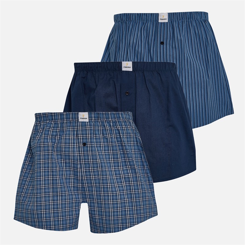 Farah Mens Mofty Three Pack Woven Boxer Shorts Navy Blue White Check/Navy/Navy Blue White Stripe