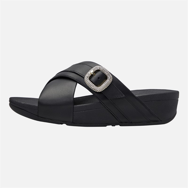 FitFlop Womens Lulu Crystal Buckle Leather Cross Strap Sliders Black
