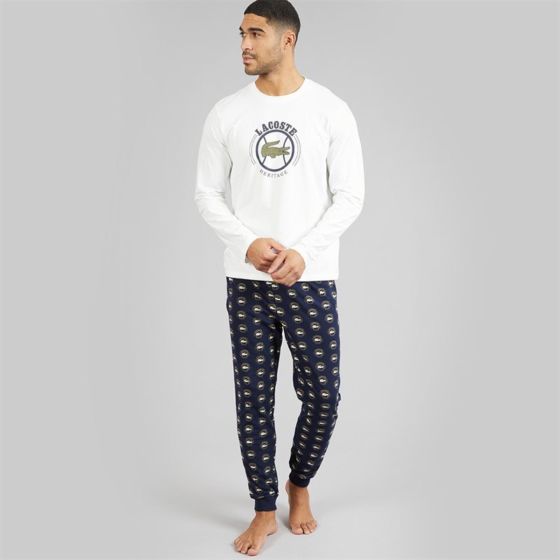 Lacoste Mens Printed Pyjama Set White/Navy Blue