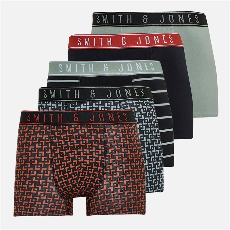 Smith And Jones Mens Claverton Five Pack Boxer Shorts AOP/Black/AOP/Sage/Yarn Dyed Stripe Aop/Black/Aop /Sage/Yarn Dyed Stripe