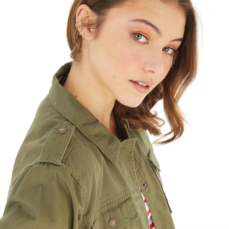- French Connection press-stud fastening utility jacket. Our model is 5'9'' and wears a size S.