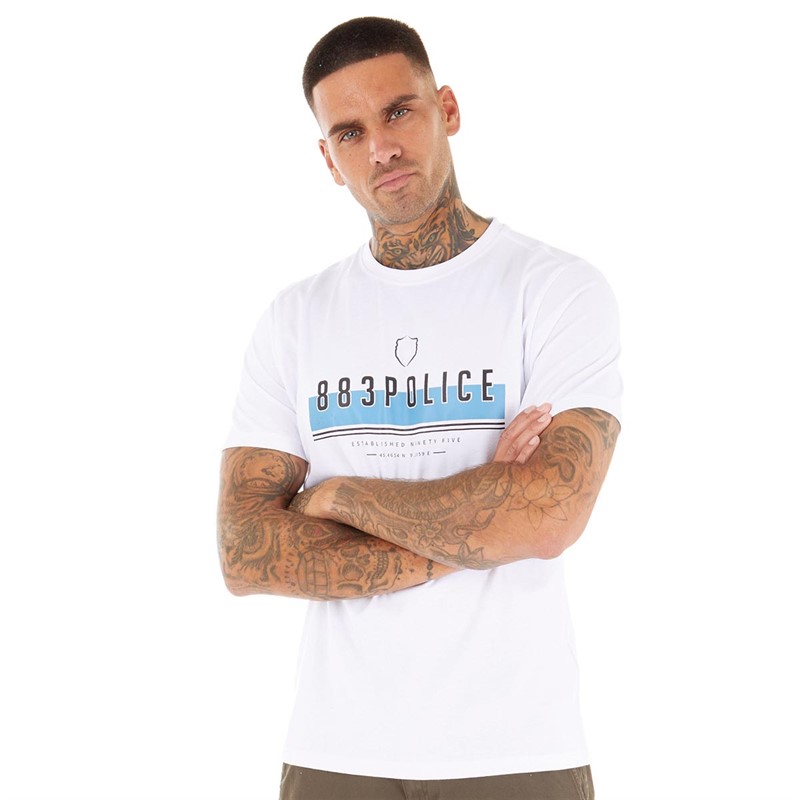 - 883 Police short sleeve t-shirt. Our model is 6'0'' with a 38.5'' chest and wears a size M.