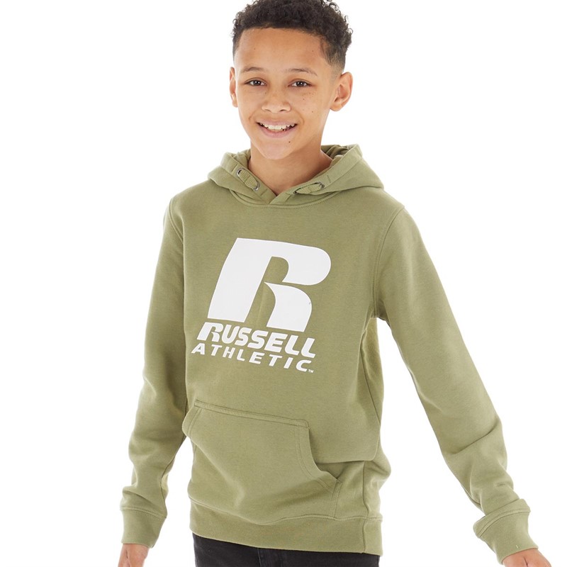 - Russell Athletic Kids brushback fleece overhead hoodie.
