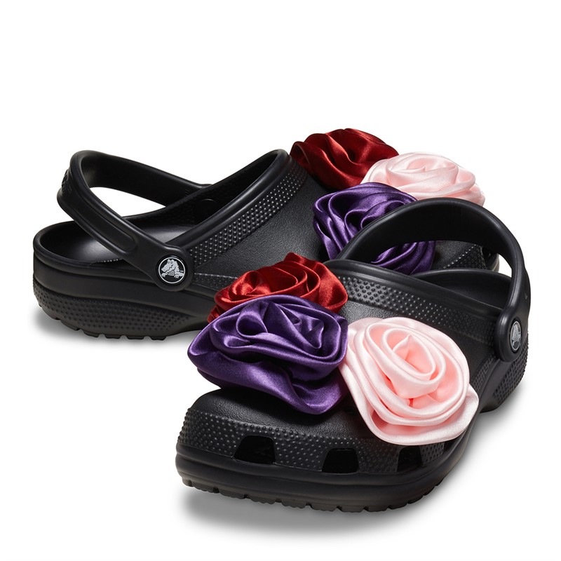 - Crocs lightweight clogs with rosette fabric embellishments.