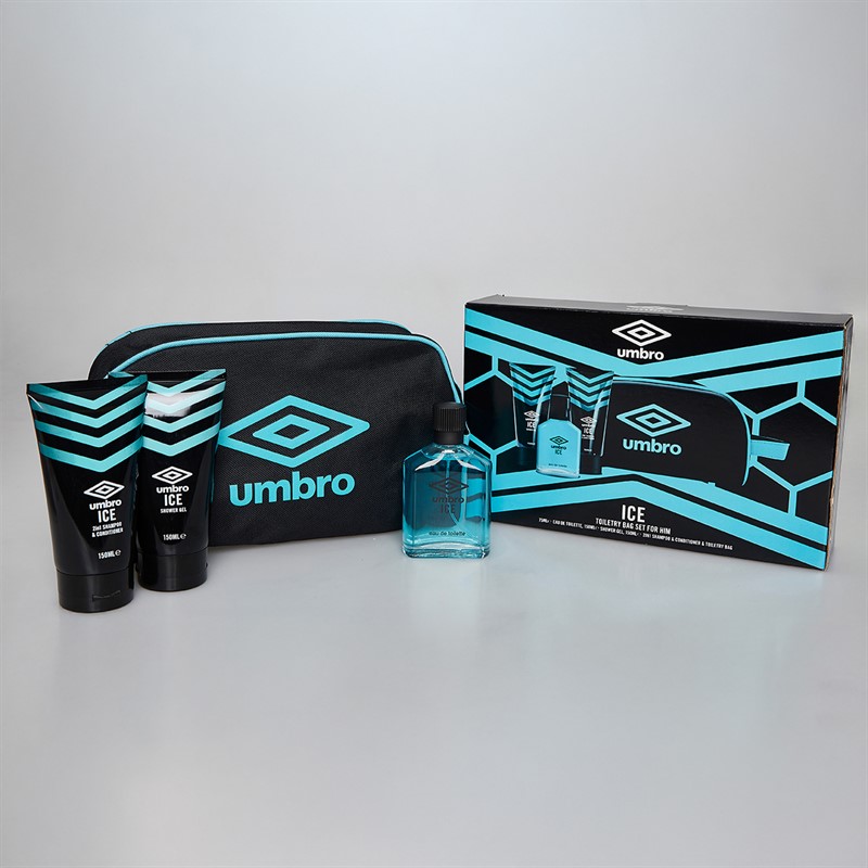 - Umbro Ice four piece gift set. Includes 75ml Eau De Toilette, 150ml 2in1 shampoo and conditioner, 150ml shower gel and toiletry bag.