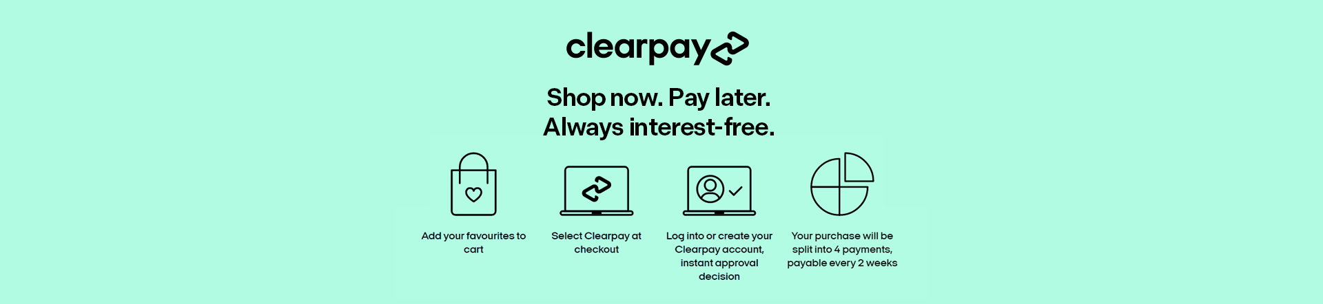 Clearpay is a payment service that lends customers a fixed amount of credit to make purchases instantly and then pay for them in 4 automatic instalments, made every 2 weeks, without any interest (late fees apply). Please use Clearpay responsibly.